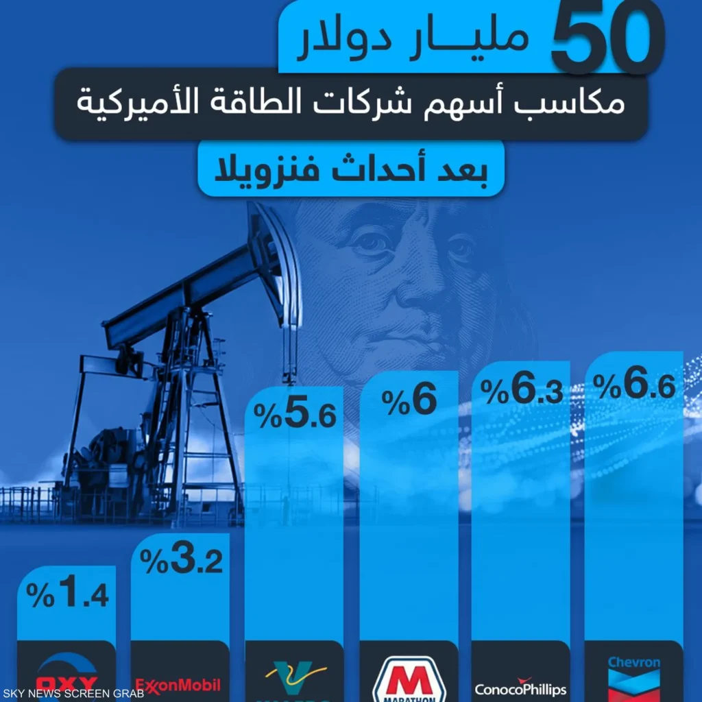 في تعاملات ما قبل افتتاح السوق، ارتفعت أسهم شركات الطاقة الأميركية بقوة، بقيادة “شيفرون” التي تُعد الشركة الأميركية الكبرى الوحيدة العاملة حاليًا في فنزويلا، مسجلة قفزة تجاوزت 7%. كما حققت شركات التكرير مكاسب تراوحت بين 5% و16%، ما أضاف أكثر من 50 مليار دولار إلى القيمة السوقية للقطاع خلال ساعات قليلة.
