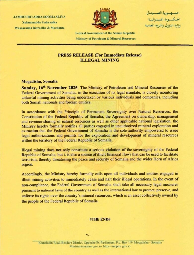 دعت الحكومة جميع الأفراد والشركات والمنظمات إلى وقف أي مفاوضات أو مشاريع متعلقة بالموارد دون إذن رسمي، مؤكدة أنها ستتخذ الإجراءات القانونية بحق المخالفين. وأشارت إلى أن تنظيم صفقات النفط والمعادن في الصومال يتم وفق اتفاقيات واضحة لتقاسم الإيرادات بين الحكومة الفيدرالية والولايات، بهدف ضمان الشفافية والعدالة.