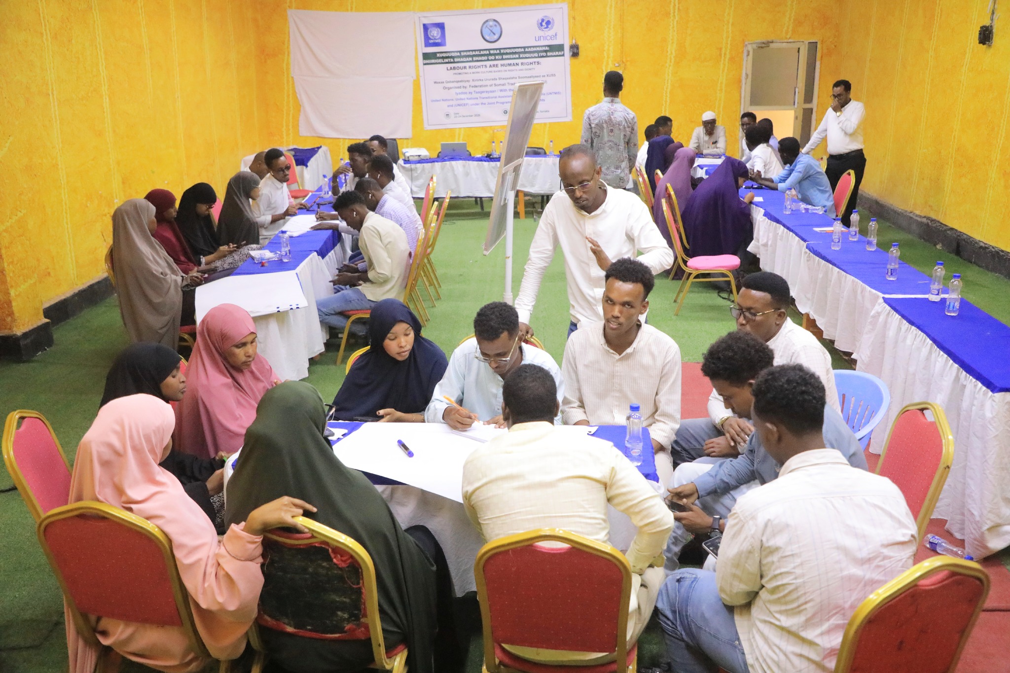 خصصت جلسات تدريبية للنساء والشباب في مقديشو، ركزت على الوقاية من العنف والتحرش في أماكن العمل، ومسارات الإبلاغ والضمانات القانونية، مع الإشارة إلى اتفاقية العنف والتحرش لعام 2019 رقم 190 الصادرة عن منظمة العمل الدولية والتي صادقت عليها الصومال. كما نُظمت دورة خاصة للأشخاص ذوي الإعاقة، وهي الأولى من نوعها، تناولت مبادئ عدم التمييز وتهيئة بيئة العمل وضمان السلامة والصحة المهنية.