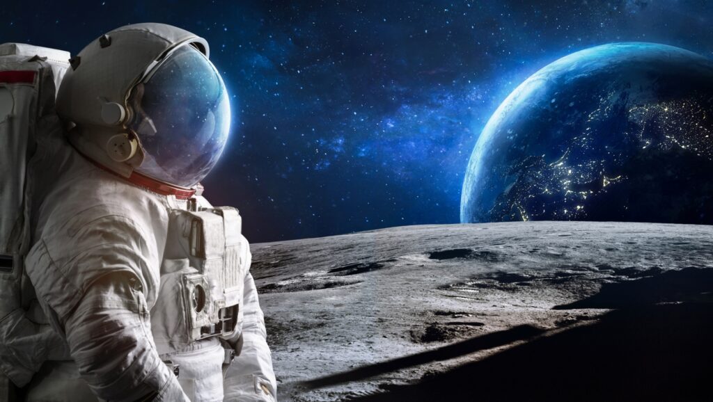 Astronaut on Moon surface. Spaceman moonwalks. Artemis lunar program and Earth. Elements of this image furnished by NASA